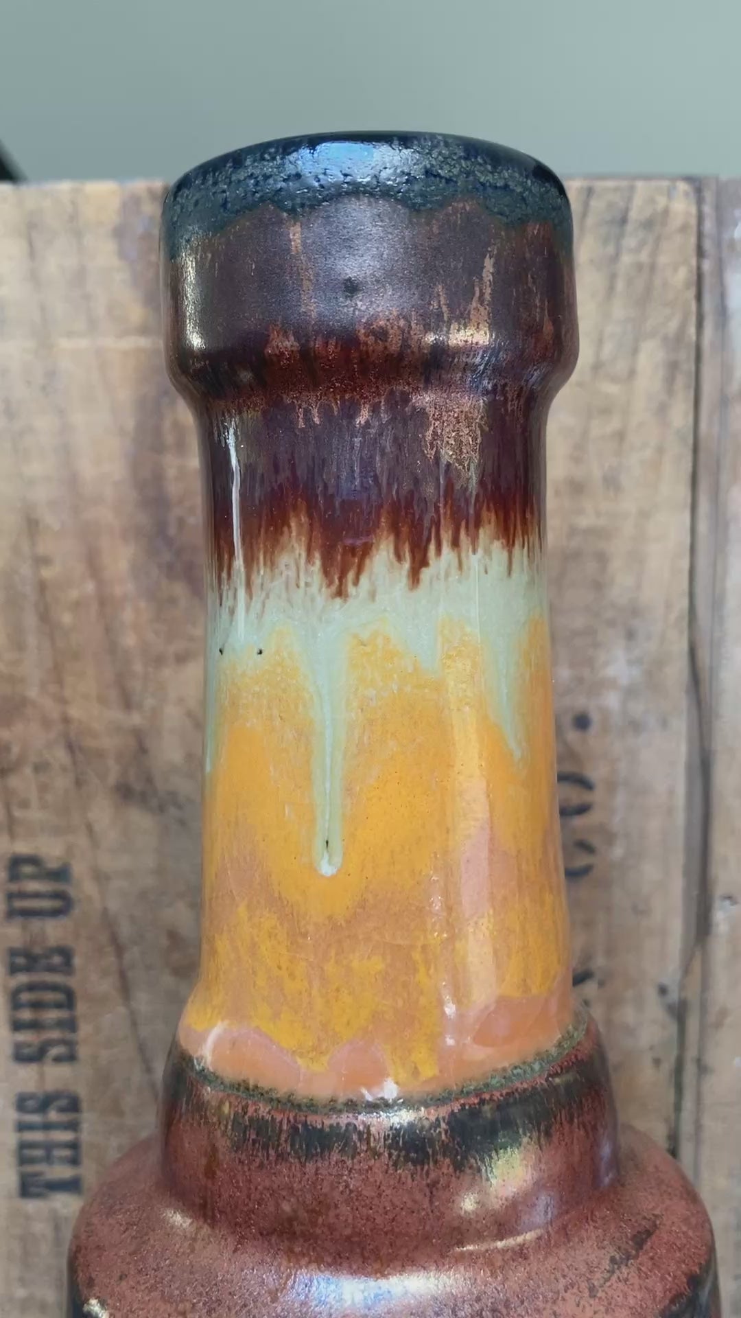 Bring classic pinup style and vintage grit to your collection with this handmade ceramic bong, finished in a vibrant blend of glossy orange glazes. A bold, brighter orange breaks over a softer, crackled orange base, while cream and antique metallic copper accents complete the look with warmth and depth.