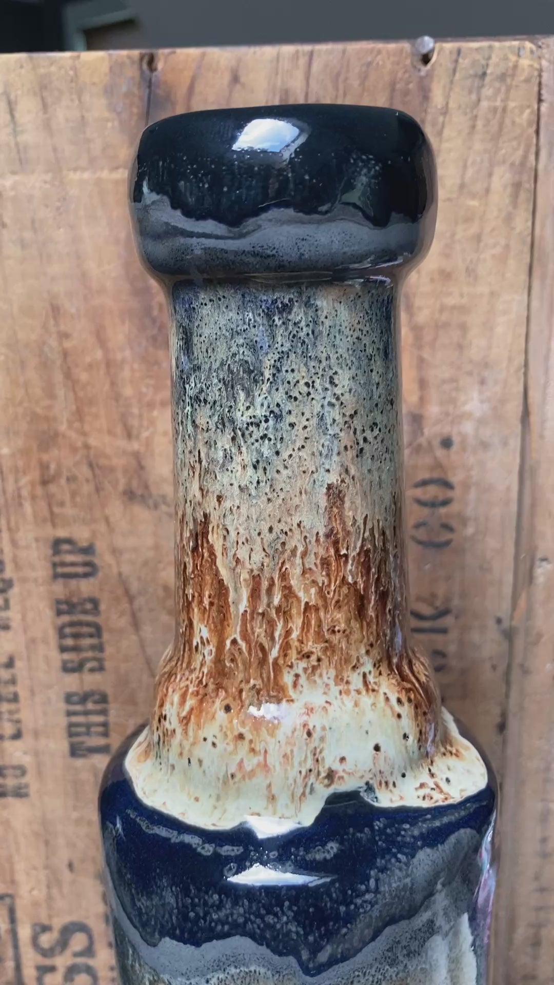 Handmade in stoneware ceramic, this wolf bong carries a clean, natural vibe. The glazes flow from glossy midnight blacks into storm grey, bone cream and warm copper, dripping and pooling like cooled lava with tiny volcanic freckles. On the back, a moon marked wolf, inked in greys and blacks over golden ochre.