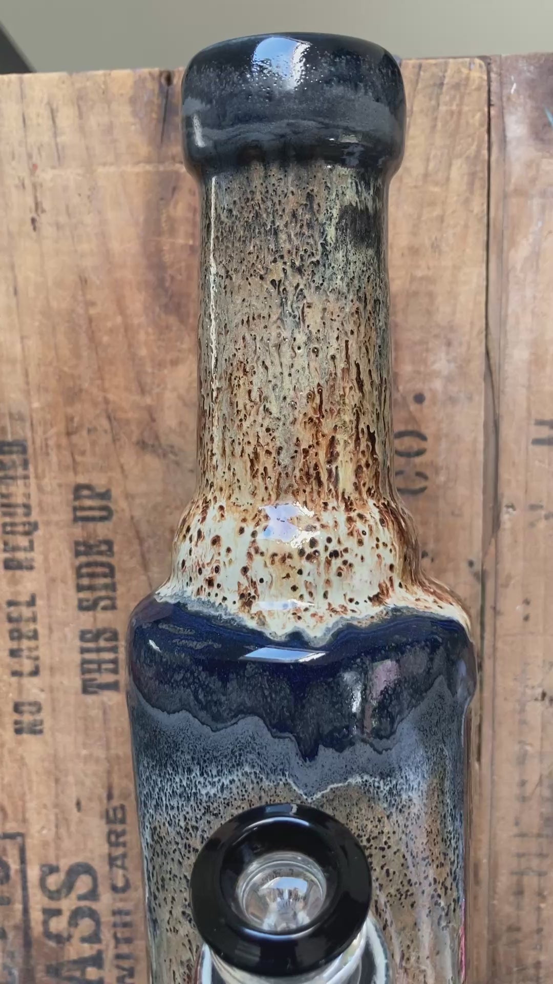 Step into a midnight dream with “The Moon,” a one of a kind handmade ceramic bong where the glaze tells its own cosmic story. The body of this piece is awash in wildly detailed patterns, streaks of glossy black and smoldering grey glazes swirl and melt into golden straw and warm, cratered browns. Up close, the glazes reveal tiny, pitted textures and rivers of color that flow like the surface of a distant world.